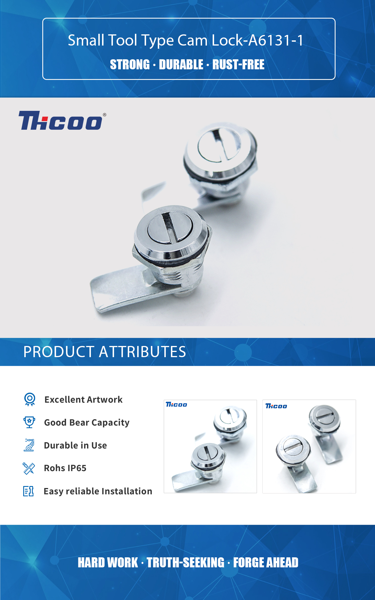 Vi har vores eget testlaboratorium og det avancerede og komplette inspektionsudstyr, som kan sikre kvaliteten af ​​produkterne. Small Tool Type Cam Lock-A6131-1 er en lille type knastlås med 1/4" boring. Den har et hærdet stål bøjle som beskytter mod at blive snurret og giver ekstra modstand mod skæring og savning.Cam Lock er et populært valg til små værktøjskasser, den er nem at betjene og bygget til at holde.Denne Cam Lock har en finish af høj kvalitet, der aldrig ruster.