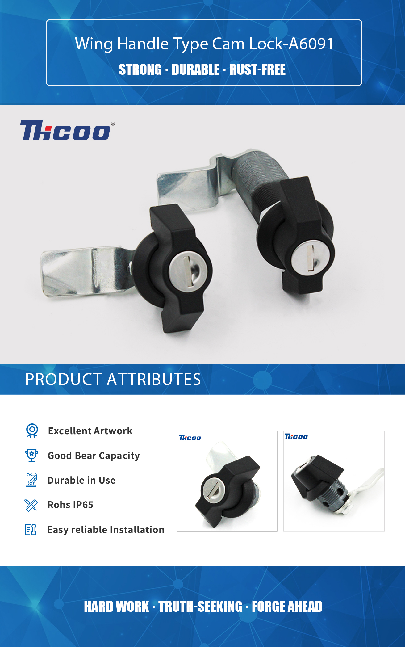 Vi har vores eget testlaboratorium og det avancerede og komplette inspektionsudstyr, som kan sikre kvaliteten af ​​produkterne. Wing Handle Type Cam Lock-A6091 er en knastlås med en 6-benet knast og en 3-benet tilholder. Den fås i forskellige farvekombinationer og leveres med 1 års producentgaranti. Håndtag Type: Cam Lock
