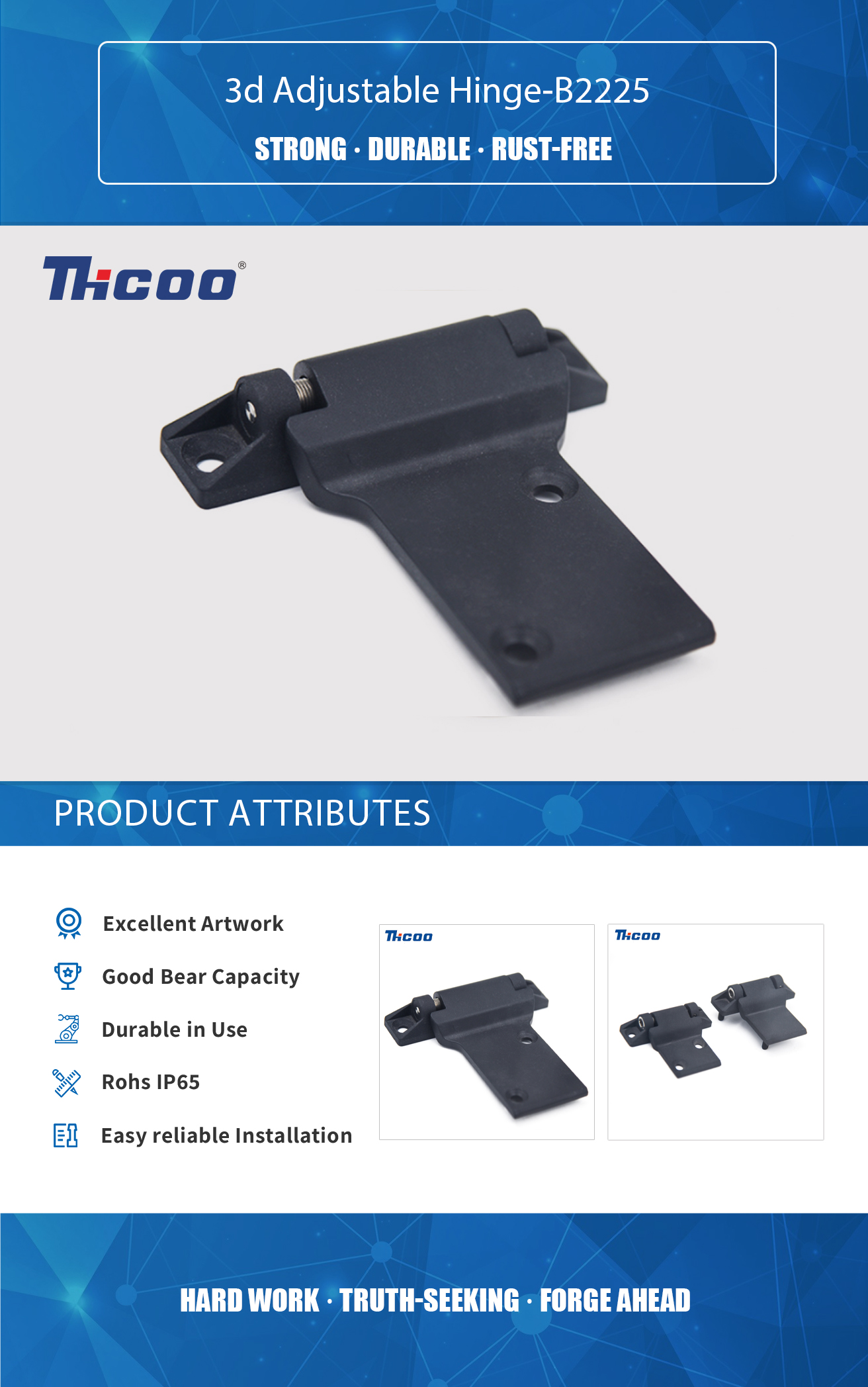 Vi har vores eget testlaboratorium og det avancerede og komplette inspektionsudstyr, som kan sikre kvaliteten af ​​produkterne.3d Justerbart Hinge-B2225 er en type hængsel, der er designet til at tillade tredimensionel bevægelse af de dele, der hængsles sammen . Den består typisk af et blad, der er monteret på en del og et blad, der er monteret på en anden del, og en stift, der forbinder de to blade og tillader delene at dreje i forhold til hinanden i tre dimensioner.