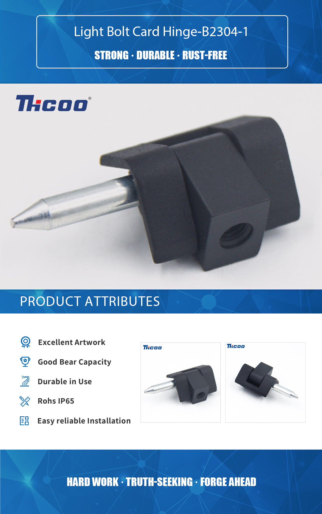 Vi har vores eget testlaboratorium og det avancerede og komplette inspektionsudstyr, som kan sikre kvaliteten af ​​produkterne. Light Bolt Card Hinge-B2304-1 ligner stiftkorthængsler, men de har typisk et stærkere og mere sikkert hold på grund af tilstedeværelsen af ​​bolten. De bruges almindeligvis i applikationer, hvor der kræves et lille letvægtshængsel, såsom på lykønskningskort, invitationer og andre papirprodukter.