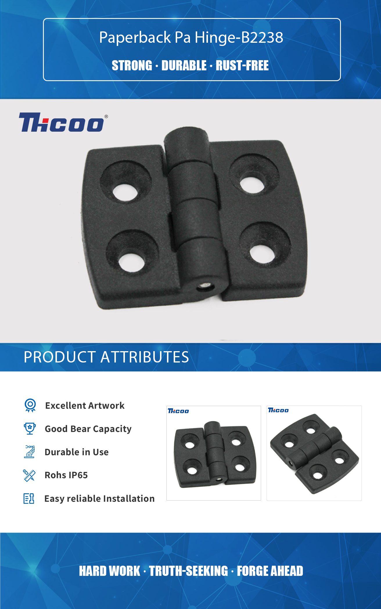 Vi har vores eget testlaboratorium og det avancerede og komplette inspektionsudstyr, som kan sikre kvaliteten af ​​produkterne. Paperback Pa Hinge-B2238 er en type hængsel, der er lavet af et sortfarvet materiale og bruges typisk til at holde en bog åben i en bestemt vinkel. Paperback-hængsler er typisk lavet af et fleksibelt materiale, såsom plastik eller et tyndt metal, og er designet til at være både lette og holdbare.