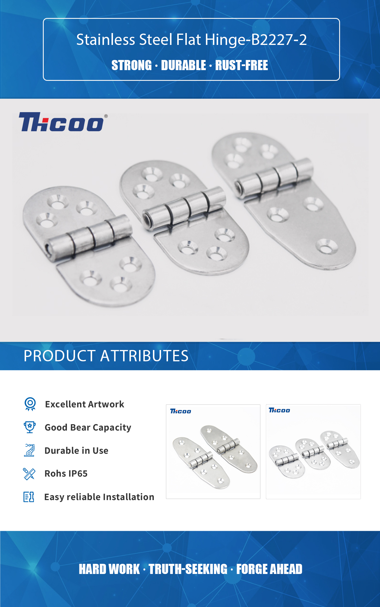 Vi har vores eget testlaboratorium og det avancerede og komplette inspektionsudstyr, som kan sikre kvaliteten af ​​produkterne. Rustfrit stål Flat Hinge-B2227-2 bruges typisk i applikationer, hvor styrke og holdbarhed er vigtige overvejelser. De kan bruges i en række forskellige miljøer, herunder boliger, kommercielle og industrielle, og er velegnede til brug i udendørs eller fugtige miljøer, hvor andre materialer kan nedbrydes over tid.